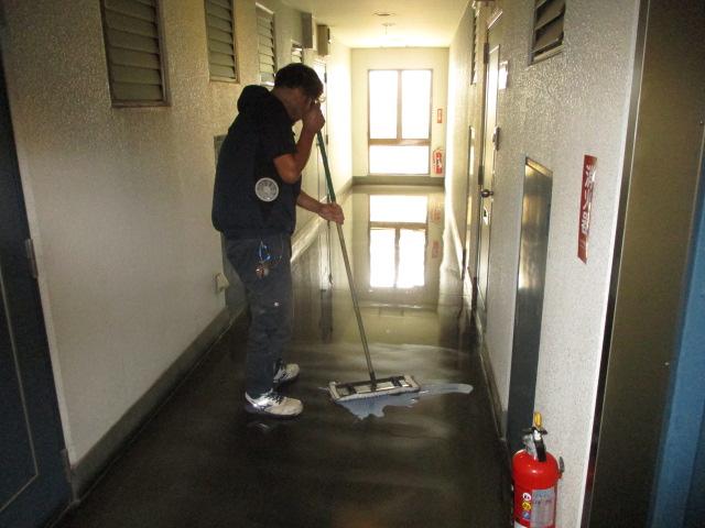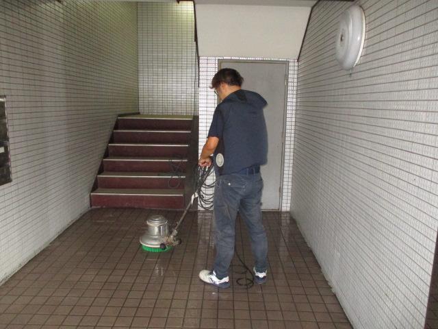 3F4Fが住居スペースとなっていて、月1回の日常清掃兼機械洗浄を実施してまいりました。内廊下になりますのでポリッシャー・バキューム・モップ拭き・WAX塗布の工程。階段はパッド手擦り・バキューム・モップ拭き。