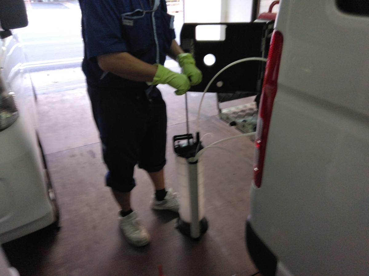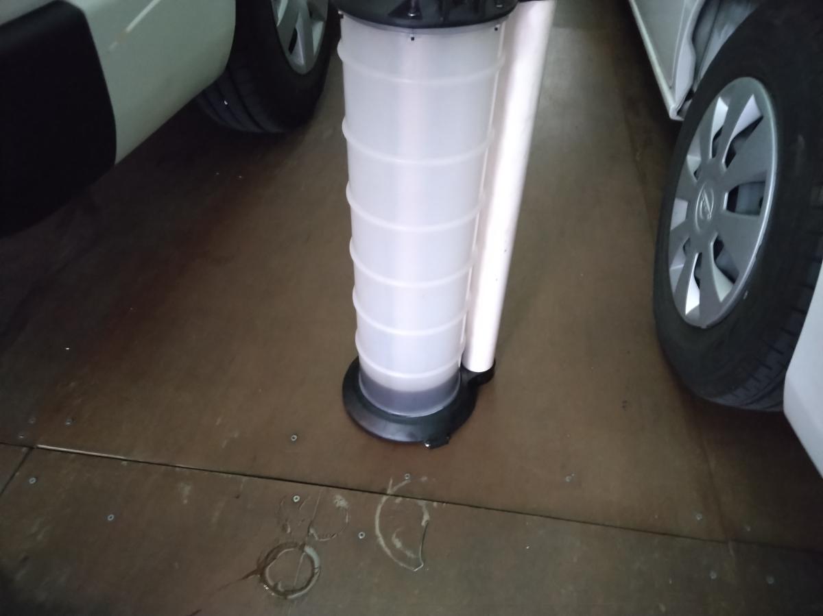 エンジンオイルチェンジャー(自転車の空気入れのような器具)にて、高圧機を傾けたりすることなく、廃油を抜き、規定量のあたらしいエンジンオイルを注入します。高圧機は既定の量以上あるいは以下のオイルですと正常に動作しない場合がありますので、しっかり計量しながら作業しております。