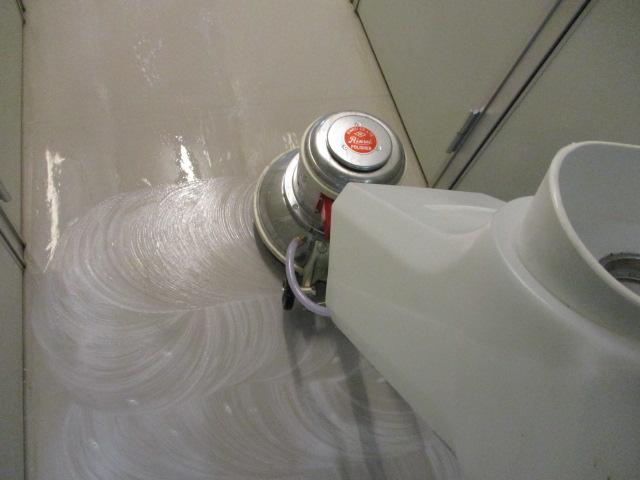 - ポリッシャーを回し、塗布してあるWAX材を剥離させていきます。※作業中は非常に滑りやすいので注意しながら作業しました。